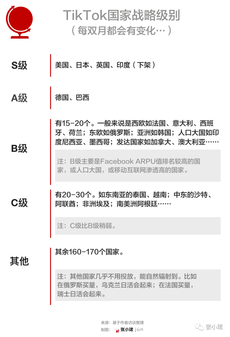 商战的狡猾就在于此。字节制定目标并非凭空设计,他们死死瞄准Facebook。字节花高薪从Facebook挖来一批管理层,其中有人把Facebook数据带了出来。数字的颗粒度精细,有些没有在财报披露过。比如,Facebook在每个国家日活多少、能赚多少钱……字节依此制作了一张涵盖100多个国家的精美表格。随后,他们巧妙地以Facebook ARPU值作为目标,倒推需要花多少钱做投放。