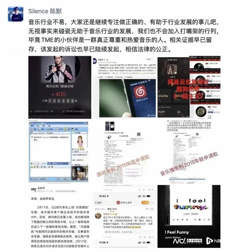 针对网易云音乐的起诉声明,4月27日下午,腾讯音乐娱乐集团品牌公关负责人陈默回应:“大家还是继续专注做正确的、有助于行业发展的事儿吧,无视事实来碰瓷无助于音乐行业的发展,我们也不会加入打嘴架的行列,毕竟TME的小伙伴是一群真正尊重和热爱音乐的人。相关证据早已留存,该发起的诉讼也早已陆续发起,相信法律的公正。”