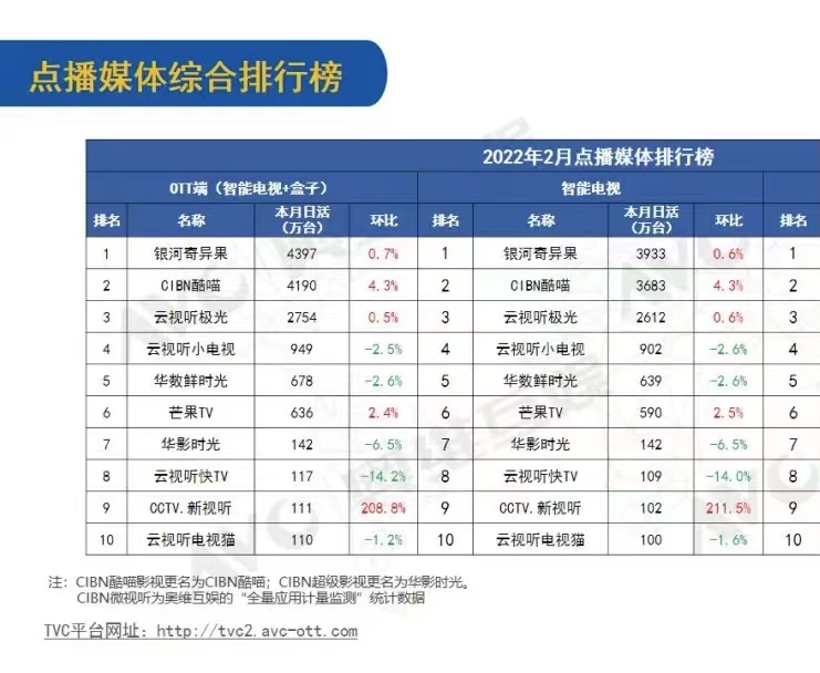 2022年一季度,国内OTT市场依然保持良好发展势头。奥维互娱数据系统显示,截止到2022年2月,我国OTT日活规模已经超过11.6亿台,继续呈上升发展态势。在点播媒体排行榜中,第一季度银河奇异果持续领跑行业第一,平均月度日活规模超4000万,其中2月日活规模最高达4397万。 CIBN酷喵影视、云视听极光紧随其后。长视频之外,B站、西瓜视频、快手等中短视频平台也开始加码大屏布局。