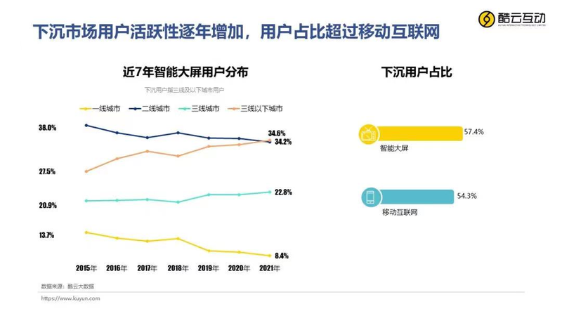 前不久,酷云互动发布《2021智能大屏生态发展白皮书》报告显示,2021年,智能大屏的家庭渗透率已经近84%,具体到用户分布上,下沉市场用户活跃度逐年增加,且超过移动互联网用户。在下沉用户中较为明显的变化是,三线以下城市用户占比首次超过二线城市,升至用户占比的首位。借助智能电视在中低线城市的持续扩张,长视频在下沉市场将获得大幅增长。