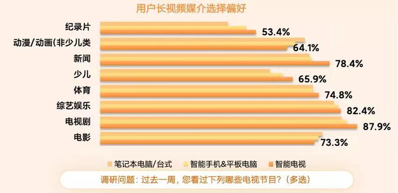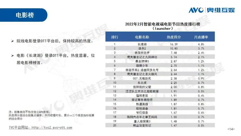 在内容消费偏好上,除了头部上新内容在OTT端表现可观,一些经典片库内容,以及合家欢、军旅类作品同样保持较高热度。例如,院线电影《长津湖》连续位居奥维1-3月智能电视端电影热度前列,不断释放出长尾价值。同时,《天下人家》《百战天狼》等经典老剧也取得了不俗表现。