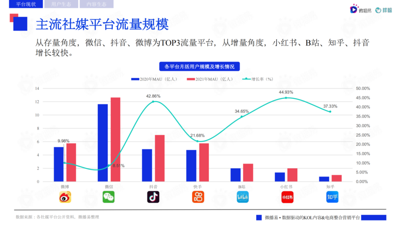 过去两年月平均新增用户数据对比,以抖音、快手为代表的短视频平台月平均新增用户均在1000万人以上,用户规模保持高速增长,其中抖音实现翻倍增长;微博、微信平台2021年较2020年与新增用户涨幅明显,其中微信的大幅增长不排除视频号高速发展;B站、小红书、知乎均保持在百万量级的月新增用户涨幅。