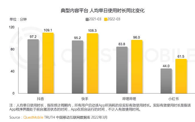 B站上线竖屏视频却激发了不小讨论,有许多人认为这是对内容生态的破坏;也有用户认为,觉得使用起来很方便,每天刷B站的时间也变长了。据数据统计,2022年一季度单个用户日均使用时间达到 95 分钟,创下公司运营以来最高纪录。从 2021年Q1的82分钟,增长到95分钟,提高了15.85%。