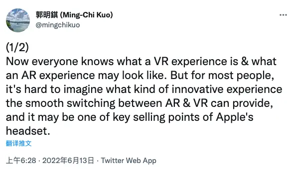 郭明錤今天发布推文称:“现在,每个人都知道VR体验的感觉,AR体验可能是怎样的。但对于大多数人来说,很难想象AR和VR之间的顺畅切换能够提供什么样的创新体验,这可能是苹果头戴设备的关键卖点之一。”