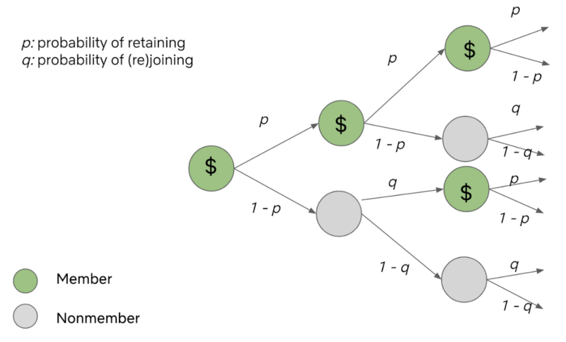 通过马尔可夫链,可以估计出会员和非会员的增量值,从而捕获未来潜在连接的数值。