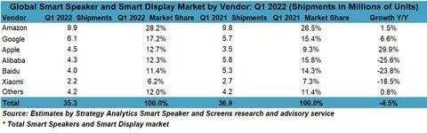 根据Strategy Analytics 的估计,智能音箱总出货量同比下降5%,达到3530万台,仅是市场历史上第二次同比下降。