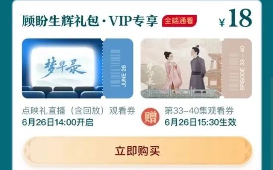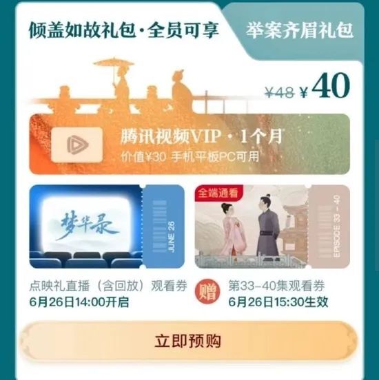 其中,会员购买价为18元,包含点映礼直播观看券和大结局第33-40集观看券(6月26日15:30生效);另一款不限会员,全员可购买,价格为40元,除了上述两种券外,还增加了一个月腾讯视频VIP。