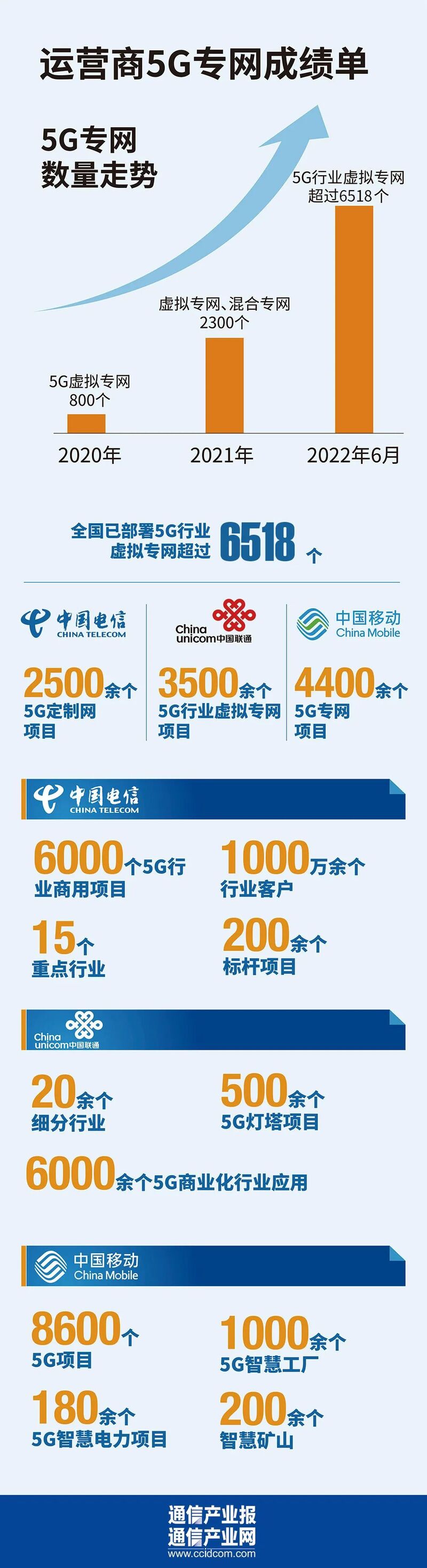 目前,中国电信已累计打造了5G定制网项目超2500个,累计5G行业商用项目超6000个;中国联通打造超过400个5G应用场景,3500个5G行业虚拟专网项目,6000个5G商业化行业应用项目;中国移动已累计落地5G项目超8600个,打造了200个5G龙头项目,最新5G专网数量4400余个,并带动DICT项目签约金额超160亿元。