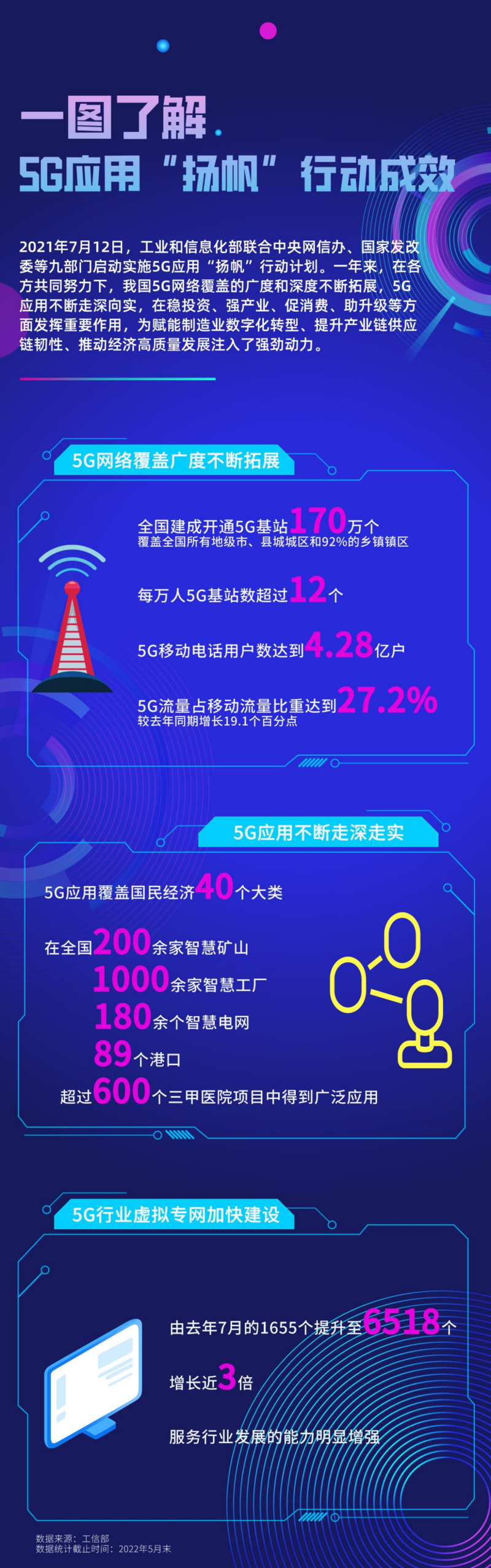 为深入贯彻落实习近平总书记关于加快5G等新型基础设施建设、积极丰富5G技术应用场景的重要指示精神,2021年7月12日,工业和信息化部联合中央网信办、国家发改委等九部门启动实施5G应用“扬帆”行动计划。一年来,在各方共同努力下,我国5G网络覆盖的广度和深度不断拓展,5G应用不断走深向实,在稳投资、强产业、促消费、助升级等方面发挥重要作用,为赋能制造业数字化转型、提升产业链供应链韧性、推动经济高质量发展注入了强劲动力。