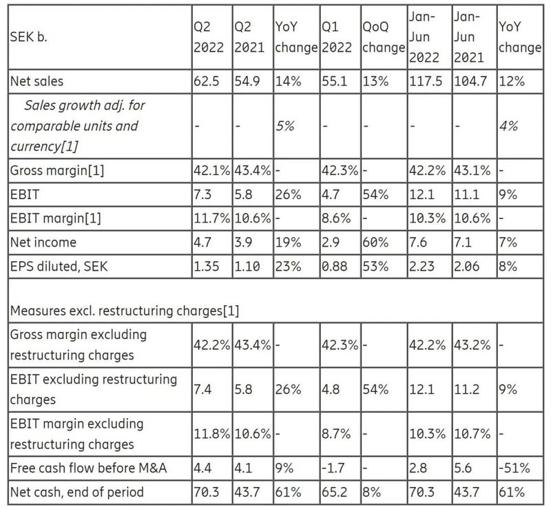 2022年第二季度,爱立信的毛利率为42.1%(2021年Q2则为43.4%),不包括重组费用的毛利率为42.2%(2021年Q2则为43.4%)。