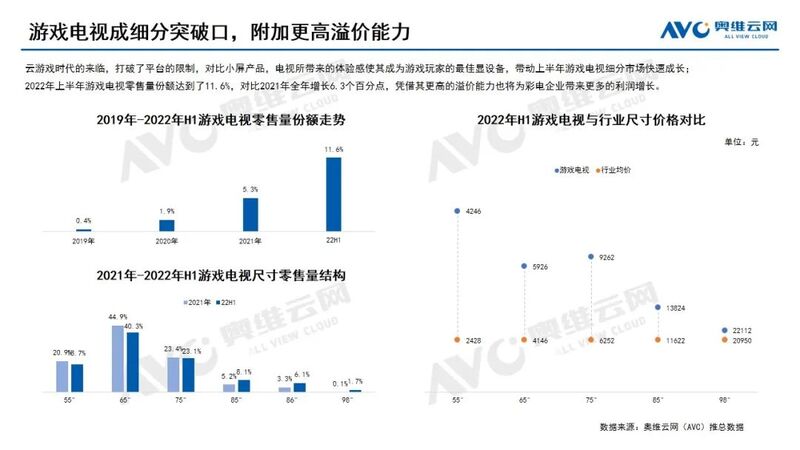 从细分领域来看,游戏电视成为了细分市场的突破口,2022年上半年游戏电视零售量份额达到了11.6%,对比2021年全年增长6.3个百分点,凭借其更高的溢价能力也将为彩电企业带来更多的利润增长。