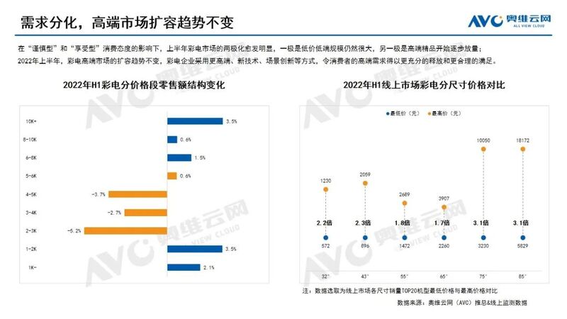 而在“谨慎型”和“享受型”消费态度的影响下,中国彩电市场的两极化愈发明显,一极是低端规模仍然很大,另一极是高端精品逐步放量。2022年上半年,彩电高端市场的扩容趋势不变,彩电企业采用更高端、新技术、场景创新等方式,令消费者的高端需求得以更充分的释放和更合理的满足。