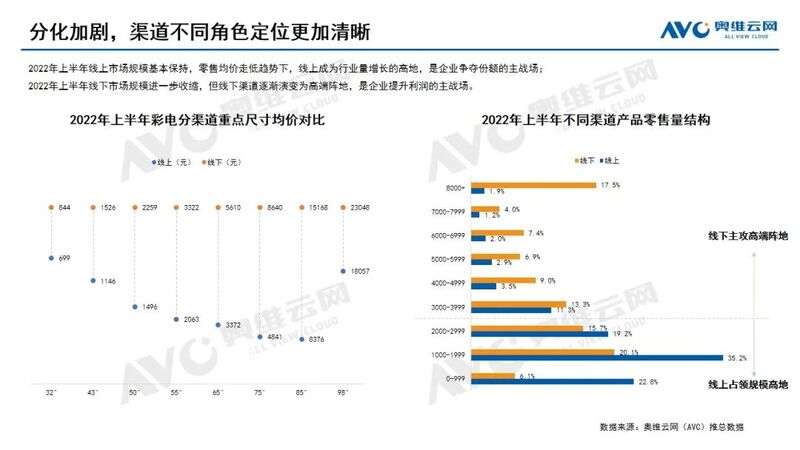 2022年上半年线上市场规模基本保持,零售均价走低趋势下,线上成为行业量增长的高地,是企业争夺份额的主战场。而线下市场因受部分区域卖场停摆和物流阻塞等问题的影响,规模进一步收缩,但线下渠道逐渐演变为高端阵地,是企业提升利润的主战场。