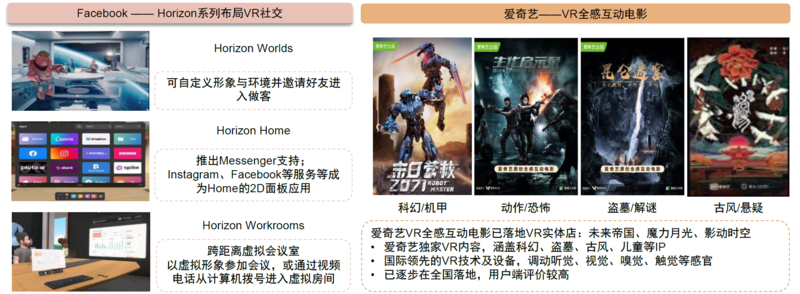 ►爱奇艺深耕VR内容,推动内容形态革新。作为国内首批入局VR领域的科技娱乐公司,爱奇艺一直以来不断推动内容形态革新,拓展VR产业价值空间。自2020年起,立足于自身在VR全感视频内容的领先优势,积极打造线下全感电影院,构建全感娱乐线下体验产业。