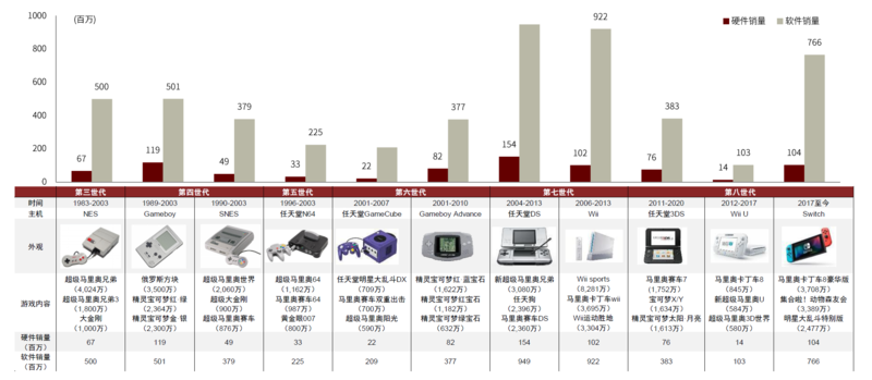 第三世代:1983年,任天堂通过NES主机切入游戏主机市场。由于红白机在性能上实现了一定突破,以及自主研发的《超级马里奥兄弟》、《大金刚》、《塞尔达传说》等游戏,在玩法和题材上不断创新,成为红白机的经典内容,从而打开了日本和北美游戏市场。此后《魂斗罗》、《洛克人》等优秀的第三方内容开始陆续登录红白机平台,巩固了任天堂的内容壁垒。最终红白机成为第三世代的胜利者,据任天堂官网数据显示,NES主机(已停售)累计销量达到6,700万。