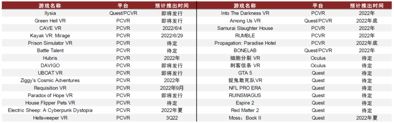 资料来源:各VR内容平台,中金公司研究部 注:预计推出时间来源自Steam官网及Meta第二届Gaming Showcase发布会
