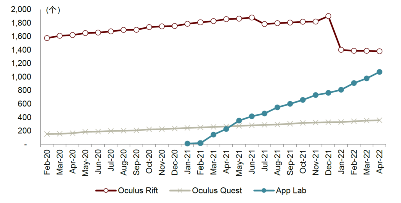 ►内容数量快速增加,形成良性创作生态。Oculus内容数量快速提升。据青亭网数据显示,截止2022年4月,Oculus Rift、Quest、APP Lab平台分别拥有1,381/357/1,074款应用。此外,据Meta第二届Gaming Showcase发布会,多款IP大作如《捉鬼敢死队VR》、《NFL PRO ERA》,以及热门VR游戏续作如《Espire 2》、《BONELAB》等即将登录Quest 2平台。我们认为,VR游戏续作的推出,意味着Quest平台游戏生态正在步入更长久、稳定的发展方向;同时基于大IP的高质量VR游戏不断涌现,意味着Oculus平台效应已经初步显现,更多的高质量内容厂商正逐步加入Oculus内容生态。