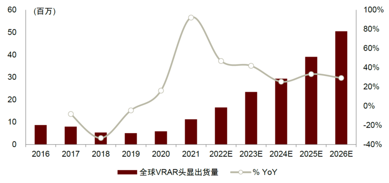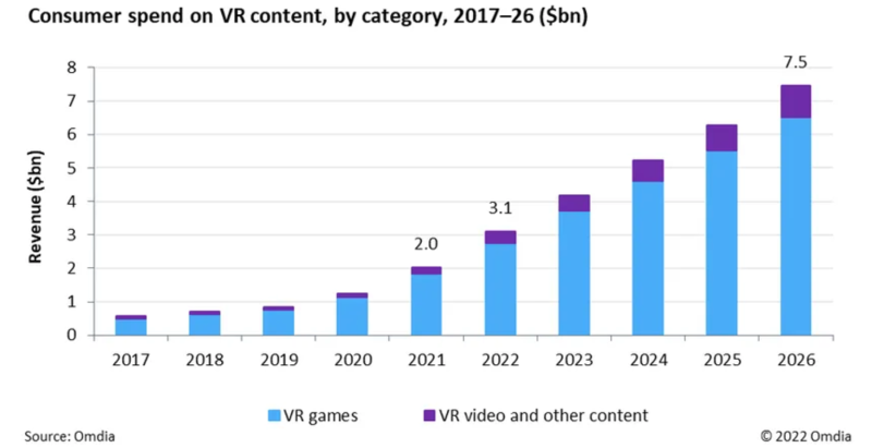 伴随着硬件产品渗透率的不断提升,我们认为消费级VR的应用场景将会向社交、办公、视频等领域不断拓展,促进VR消费级内容生态的繁荣。据Omdia数据显示,2021年VR头显消费级内容市场总收入为20亿美元,预计2026年将达到75亿美元,CAGR为20.3%。