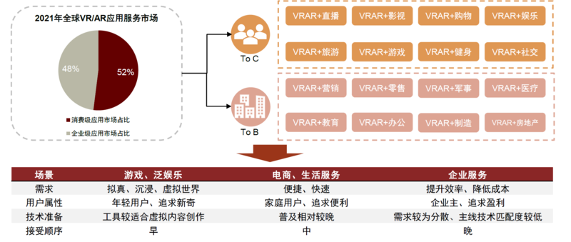 VR行业应用场景多点开花,C端市场率先崛起。目前VR行业涵盖硬件、内容、平台等领域,覆盖B端/C端多个应用场景。从行业规律、用户属性以及技术准备的角度上看,游戏应用场景以及开发工具与VR设备匹配度更高,同时游戏用户对于虚拟内容的接受度更高。因此,游戏行业在VR行业初期率先崛起。据前瞻产业研究院数据显示,2021年VR游戏、视频等泛娱乐消费级应用市场占比约为52%,是目前VR主要的应用领域。