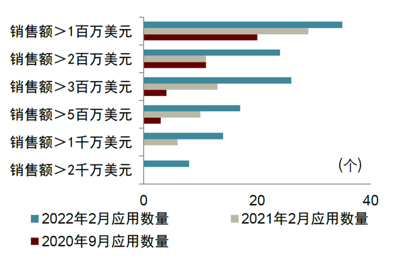 ►优质厂商入局,热门游戏出圈。2020年3月,V社发布高质量3A级VR游戏《Half-Life:Alyx》,该游戏凭借其精细的画面以及真实的交互体验出圈,在各大媒体斩获较高的评价,成为次世代VR重度游戏的标志性代表作。此外,该产品颠覆了VR游戏的固有形态,推动游戏创新和质量提升。据Steam数据显示,在 VR 相关游戏在评论数大于100 条的游戏中,2021年新发布的VR游戏好评率达到95%,而2016年好评率仅为80%。受益于内容数量和质量快速提升,游戏变现能力增强,应用开发者收入不断提升。据Meta数据显示,以Quest商店为例,截止2022年2月,有8款应用流水超过2000万美元,124个应用程序获得100万美元的收入,同比增长80%。