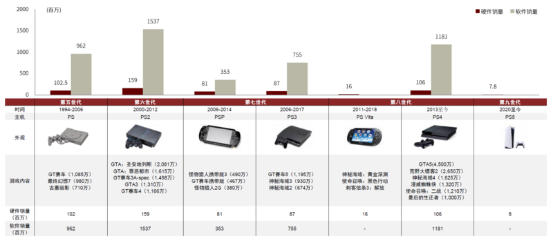 注:PS 4软硬件销量截止至2019年12月,PS 5软硬件销量截止至2021年4月,其它设备软硬件销量为停售后累计总销量