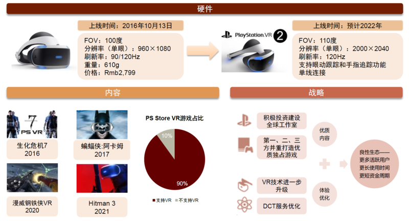 硬件方面:新品PS VR2将于2022年上线。索尼第一代PSVR于2016年10月上线,截至2019年底共卖出500万套。据CES 2022,PSVR 2预计最早将在2022年发售,相比于第一代PSVR,将在FOV以及分辨率等方面进行全面升级,并从多线缆提升至单线缆连接;此外,新一代PSVR将支持提供眼动跟踪和手指追踪功能,致力于优化VR设备体验。