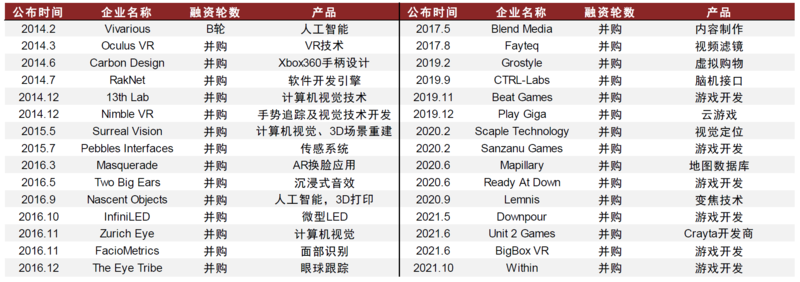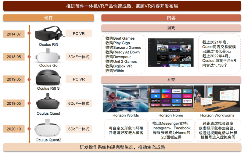 硬件方面:收购Oculus建立硬件壁垒,Quest 2成为标杆产品。2014年7月,Meta宣布以20亿美元的价格收购Oculus,并在此之后以Oculus名义不断收购VR硬件技术公司,巩固自身的硬件壁垒。自2013年起,陆续推出七款VR硬件产品,其中Quest 2以高性价比优势成为真正的消费级VR硬件产品。该产品在显示参数、价格和外观设计等方面均满足了VR用户的基本需求,奠定了VR头显的参数标准,销量远超Oculus系列其他产品。据青亭网数据显示,2022年4月,Oculus品牌产品市占率为66.65%,占据市场领先地位,其中Quest 2市占率为47.97%,排名第一。此外,在Facebook Connect 2021大会上,Meta发布了下一代高端VR头显Project Cambria,公司表示该设备将会采用一系列高端技术,备受市场关注。
