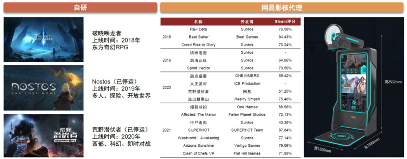 ►网易通过自研+代理布局VR内容。自研方面,网易已推出三款VR游戏,分别为破晓唤龙者、Nostos(已停运)以及荒野潜伏者(已停运)。此外,网易与美国VR顶尖内容厂商Survios合资成立网易影核(Netvios),通过VR线下体验店为用户提供网易、Survios和全球精选的三方VR内容。截止2021年底,网易影核在全国已有上千家长期稳定合作的线下VR体验中心,并合计代理近20款游戏。据2022年网易游戏520发布会,《迷室VR》、《动感队长:星球保卫战》等多款VR新作也将会在网易影核平台陆续上线。