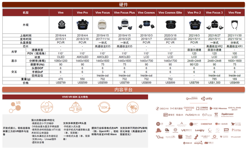 硬件方面:HTC布局企业级与消费级硬件,并持续进行产品迭代。2015年3月,HTC发布了与Valve联手打造的HTC VIVE。并在此后,先后推出了Cosmos系列、Focus系列以及Pro系列,其中Cosmos和Focus系列主要面向B端市场,Pro系列主要面向C端市场。2021年5月,HTC发布了Focus和Pro系列的最新产品VIVE Focus 3和VIVE Pro 2,两款设备在芯片、视场角、分辨率、刷新率等参数上均达到较高配置。此外,在2021年10月,HTC还推出了全新形态沉浸式VR眼镜VIVE Flow,重点关注现代人情绪和心理健康。