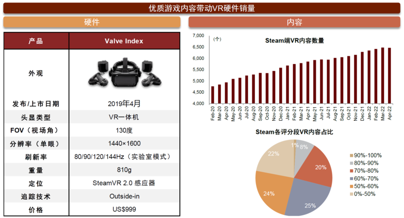 硬件方面:提供更优质的VR使用体验。此前Valve与HTC合作研发VR硬件。2019年,Valve推出了独自研发的VR硬件产品Valve Index,该产品特点是分辨率最高可达到144Hz(实验室模式),并配备可跟踪手部所有操作的“Knuckles controllers” ,为用户带来更丰富的交互体验。此外该设备还采用外倾式镜片和近耳式扬声器,提高用户使用过程的舒适度。