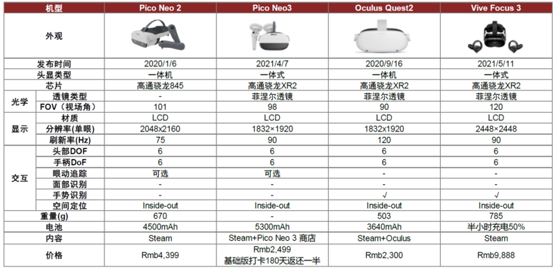 国内VR硬件产品性能已达到国际水平。通过Pico Neo 2和Neo 3与目前国际顶尖的VR消费级产品Oculus Quest 2和 VIVE Focus 3进行对比,Pico产品在各项参数和体验上,已经达到或者接近头部产品水平。