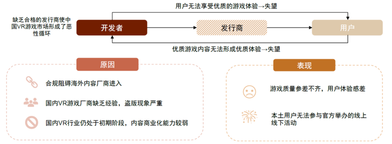 国内内容生态仍在完善阶段。由于:1)海外主流的线上内容分发平台无法在国内运营,海外内容厂商无法独自过审,进入国内市场门槛过高;2)国内VR行业仍处于初期阶段,内容上商业化能力较弱;3)VR游戏开发类似于主机游戏的开发,国内游戏开发者相对欠缺经验,且国内盗版现象严重等原因,导致了国内用户接触到的VR游戏质量良莠不齐,且受制于服务器原因,联机体验感差。因此,中国VR游戏市场陷入恶性循环、目前仍处于完善阶段。