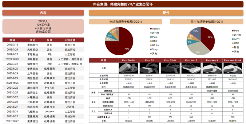 硬件方面:2021年8月,抖音集团花费50亿元收购国内领先VR硬件厂商Pico。Pico是国内的VR硬件龙头厂商。据IDC数据显示,Pico 1Q21国内出货量约8.6万台,同比增长76%,市场份额达到37.6%,为国内第一大VR品牌;全球出货量约9.7万台,同比增长44.7%,市场份额达到8.9%。旗下VR产品分为Neo和G两大系列,其中G系列主打性价比,Neo系列相对高端。2021年5月,Pico推出新一代VR产品 Pico Neo 3,该产品不仅实现了性能升级,价格相比上一代产品Neo 2降低近2000元。Pico产品的大幅度降价,有利于VR硬件在国内实现加速渗透。