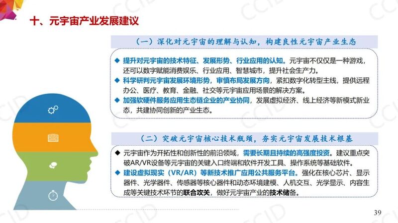 元宇宙作为开拓性和创新性的前沿领域,需要长期且持续的高强度投资。建议重点突破AR/VR设备等元宇宙的关键入口终端和软件开发工具、操作系统等基础软件。建设虚拟现实(VR/AR)等新技术推广应用公共服务平台。强化在核心芯片、显示器件、光学器件、传感器等核心器件和动态环境建模、人机交互、光学显示、内容生成等关键技术环节的联合攻关,做好元宇宙产业的技术储备。