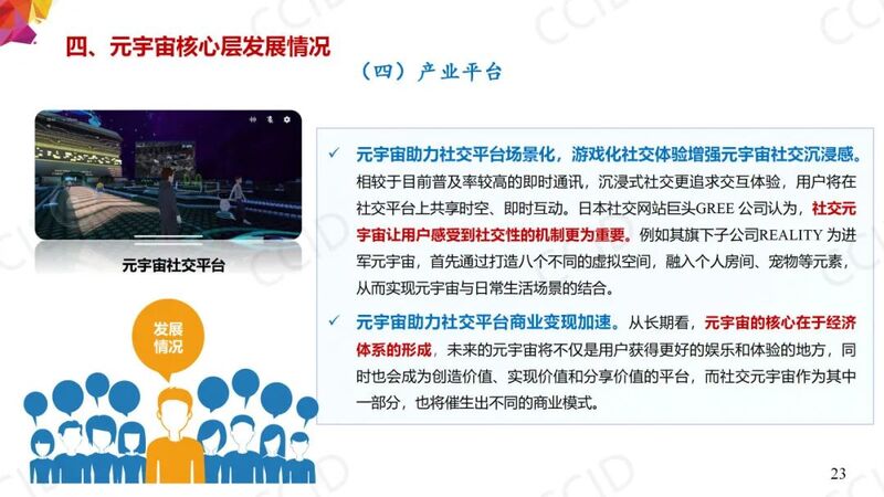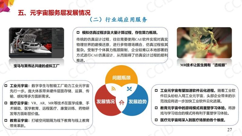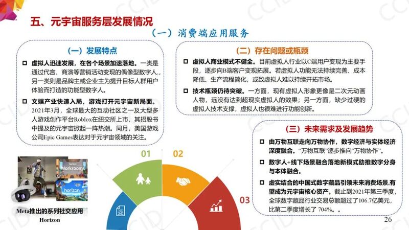应用服务层包含消费端应用服务、行业应用端服务、政府端应用。完整的“元宇宙”形成后,其将赋能工业生产、医疗健康、教育培训、文化娱乐等传统行业,创造信息消费新业态新模式,对人类的生产生活方式带来颠覆式变革。