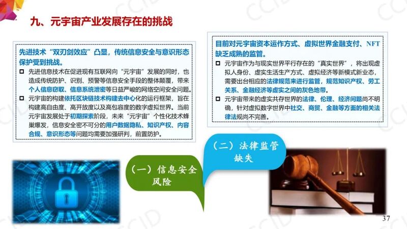 目前对元宇宙资本运作方式、虚拟世界金融支付、NFT缺乏成熟的监管。元宇宙作为与现实世界平行存在的“真实世界”,将出现虚拟人身份、虚实生活生产方式、虚拟经济等新模式新业态,需要出台相应的法律规范来进行监管,规范知识产权、劳工关系、金融经济等虚实之间的灰色地带。元宇宙带来的虚实共存世界的法律、伦理、经济问题尚不明确,针对虚拟数字世界中社交、商贸、金融等方面的相关法律法规尚不完善。