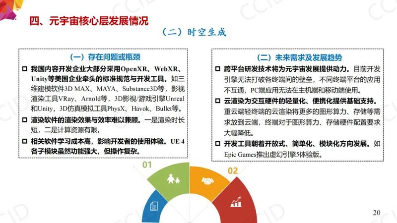 近年来我国ICT产业快速发展,并逐步在虚拟现实/增强现实(VR/AR)终端、通信网络设备、数通设备、液晶显示面板、软件交互等领域取得显著进步,构筑起产业发展长板。一方面,我国ICT行业领域,消费市场规模庞大、行业级应用场景种类繁多、企业应用创新活跃,为“元宇宙”技术蜂巢爆发创新提供有力的市场与智力支撑基础。另一方面,底层技术的缺失也带来了重大的挑战。一是VR/AR头显设备,手机、电脑、电视等消费终端提供“元宇宙”现实世界与数字世界交互的接口或界面,扩大我国终端整机既有制造优势与加速推动“元宇宙”新型智能硬件普及与应用推广爆发,将形成有力互推作用,带来广阔的发展前景。二是缺少XR专业芯片,缺少XR底层开发平台及工具,在“中美贸易”摩擦的今天,给“元宇宙”的发展带来了重大挑战。