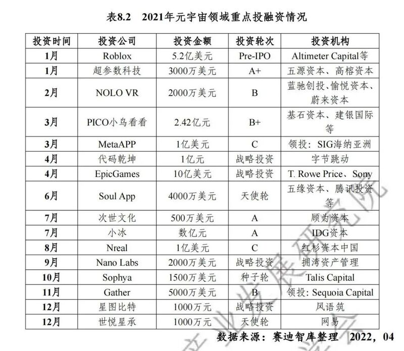 赛迪智库电子信息研究所和江苏省通信学会联合编写了《元宇宙产业链生态白皮书(2022年)》,总结了元宇宙产业发展现状,梳理了元宇宙技术体系与产业链各环节发展情况,分析了各地发展现状、投融资情况和产业发展存在问题,提出了若干措施建议,期望进一步统一产业发展共识,为行业管理部门提供决策参考。