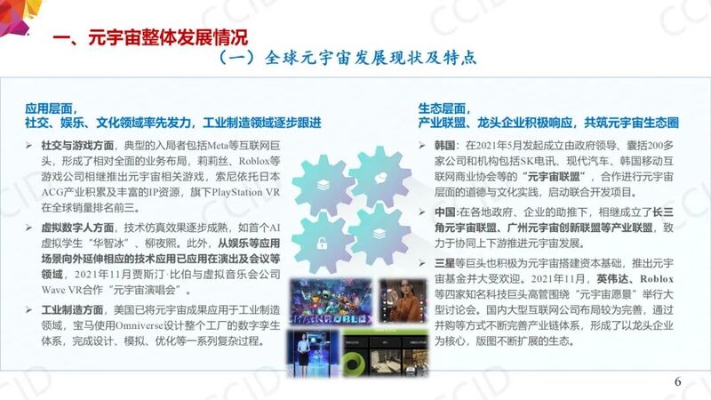 韩国科学技术和信息通信部在2021年5月发起成立了由政府领导、囊括200多家公司和机构包括SK电讯、现代汽车、韩国移动互联网商业协会等的“元宇宙联盟”,合作进行元宇宙层面的道德与文化实践,分享技术趋势及见解,并启动联合开发项目。中国在各地政府、企业的助推下,相继成立了长三角元宇宙联盟、广州元宇宙创新联盟等产业联盟,致力于协同上下游推进元宇宙发展。三星等巨头也积极为元宇宙搭建资本基础,推出元宇宙基金并大受欢迎。2021年11月,英伟达、Roblox等四家知名科技巨头高管围绕“元宇宙愿景”举行大型讨论会。国内互联网企业抢先布局,通过并购等方式不断完善产业链体系,形成了以龙头企业为核心,版图不断扩展的生态。