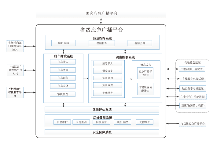 省级应急广播平台主要业务功能为上级应急广播平台和本级应急信息源的应急信息接入、处理、播发,并对应急广播播发进程及结果进行效果监测评估,架构如图2所示。
