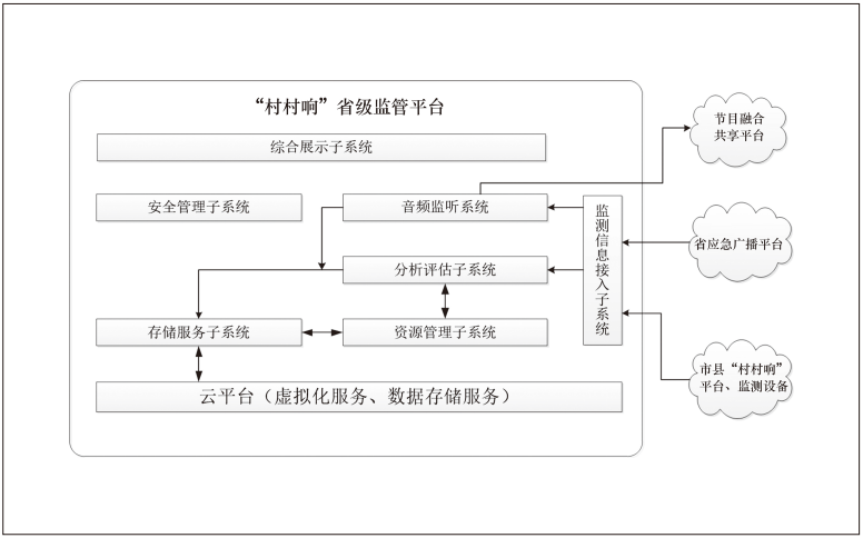 “村村响”省级监管平台主要业务功能为信息采集和数据分析两项。信息采集通过“村村响”监测适配器实时采集“村村响”系统播发内容,利用“村村响”系统平台数据接口获得“村村响”系统和终端的状态信息、地址信息、覆盖区域信息等,通过和省级应急广播平台的数据交换接口完成应急广播播发原始内容的共享。数据分析通过实时监听系统对“村村响”播发内容进行实时监听,出现异态及时告警,根据“村村响”系统和终端的状态信息、地址信息以及覆盖区域信息,对播发效果进行评估,并生成报表。平台架构如图3所示。