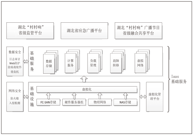 “村村响”省级广播节目融合共享平台主要业务功能为节目收录编审、节目共享存储、节目编单排期、节目打包加扰、节目点播计费、节目分发推送、节目监管统计、节目解扰播放、平台运维管理、节目共享管控等。平台采用云计算技术、流媒体点播技术、音频加扰技术、声纹监测技术构建整个节目共享和节目监管系统,架构如图4所示。