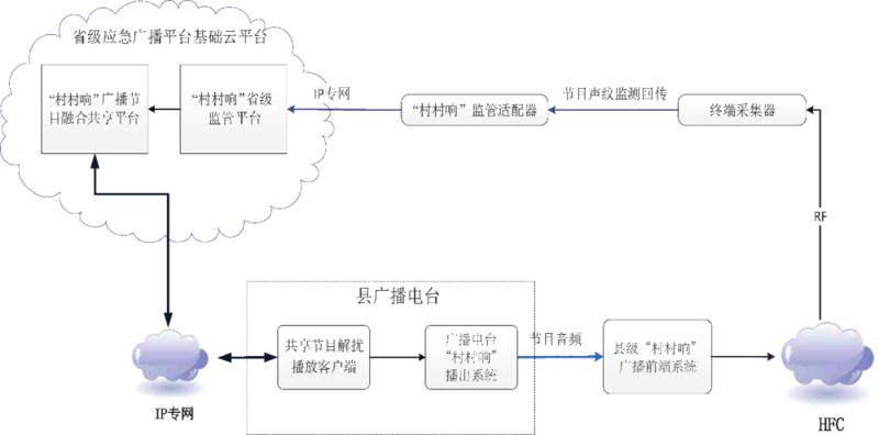 “村村响”省级监管平台将“村村响”系统监测适配器采集上传的日常广播音频内容转发给省级广播节目融合共享平台,用以对“村村响”系统节目转播内容进行声纹比对监测,监测节目播出情况。