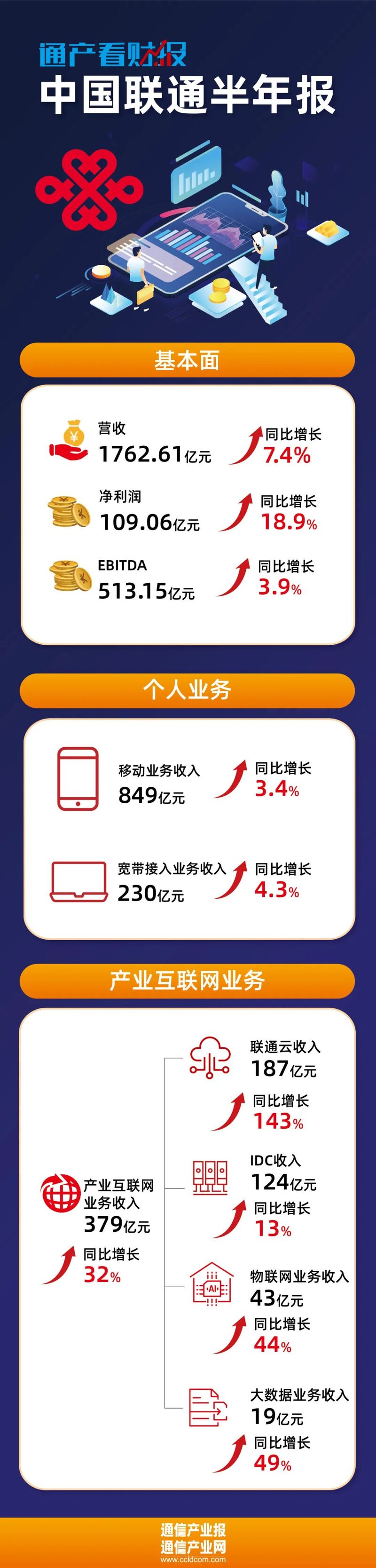 据半年报,中国联通实现产业互联网业务收入369亿元,同比提升32%,占主营业务收入的22.9%,对联通主营业务收入增长贡献率高达72%,高于电信行业同期平均值。