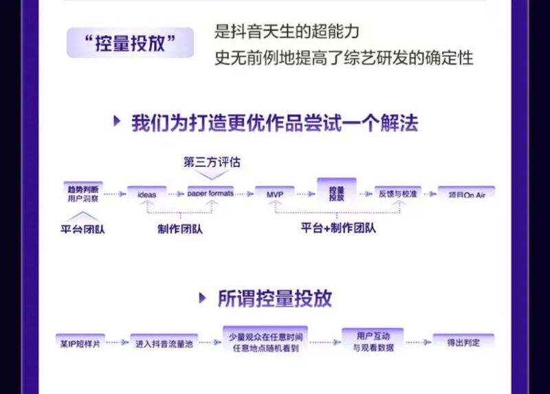 此前,抖音曾表示,这种综艺研发新模式是基于“控量投放”,通过抖音流量池的大数据功能,对于少量观众的观看行为进行分析,根据用户互动和观看数据得出判定,简而言之,即通过多维数据科学验证节目内容的可行性、可看性。