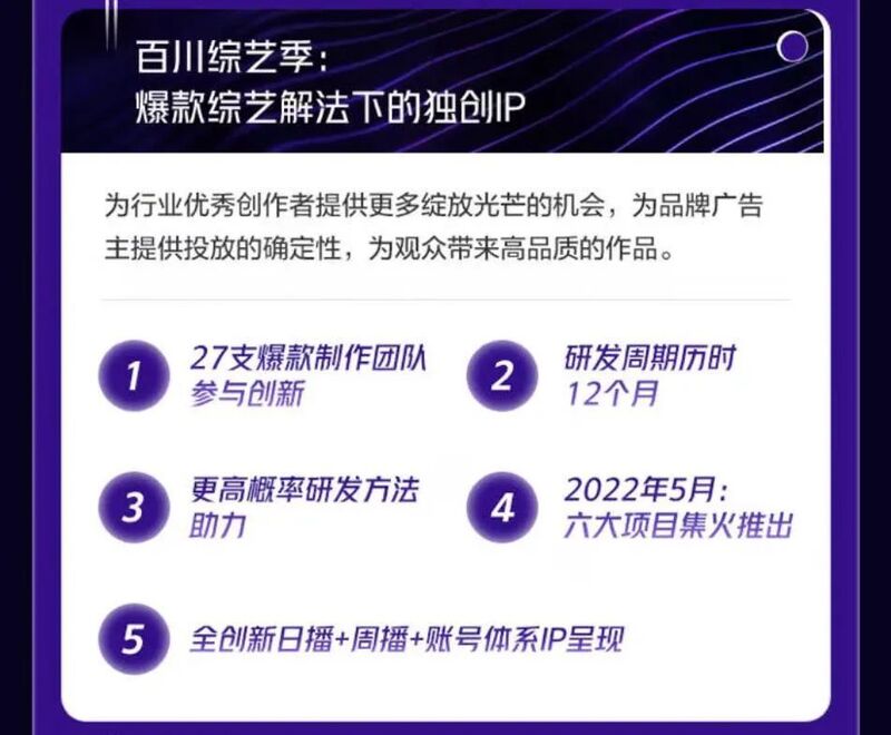 2022年初,抖音宣布启动《百川综艺季》,当时,平台对于这档节目的定位是“这是一档为爆款综艺提供解法的独创IP”,将会有27支爆款制作团队参与内容创新,历时12个月研发,当时一度被视作为“综艺制作人”竞赛节目,然而并不是。