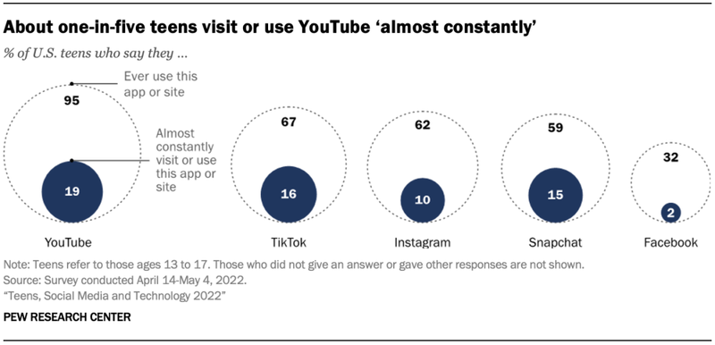 YouTube是青少年最常使用的平台,95%的人表示他们曾经或正在使用这一平台;