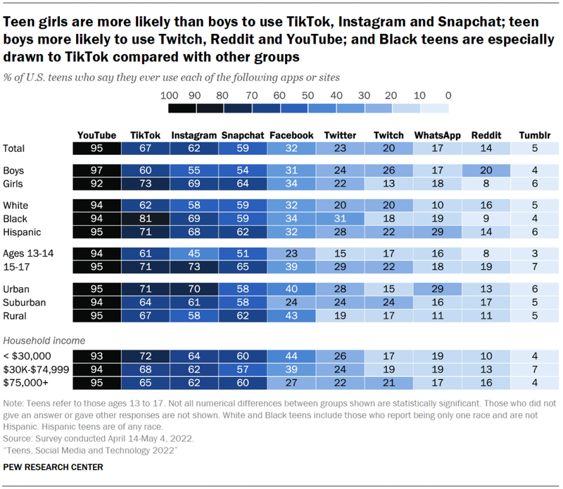 处于青少年时期的女孩们更偏向使用过TikTok、Instagram和Snapchat;