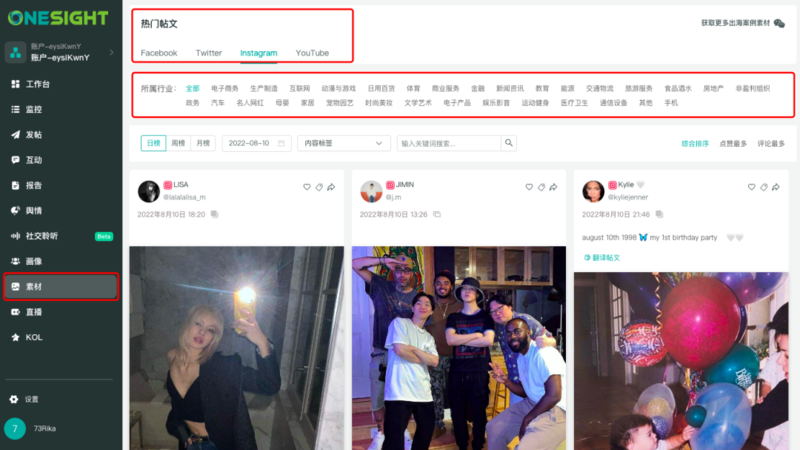 如果你需要更多内容灵感,可以在OneSight营销云的“素材”-“热门帖文”和“热门话题”中寻找各大社交媒体平台和不同行业正在流行的内容和话题,并且你还可以选择将他们收藏在你的灵感库中,以指导内容创作。