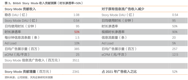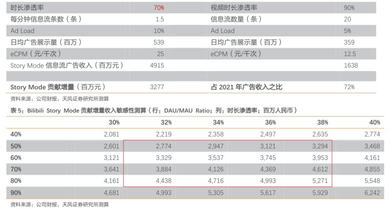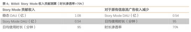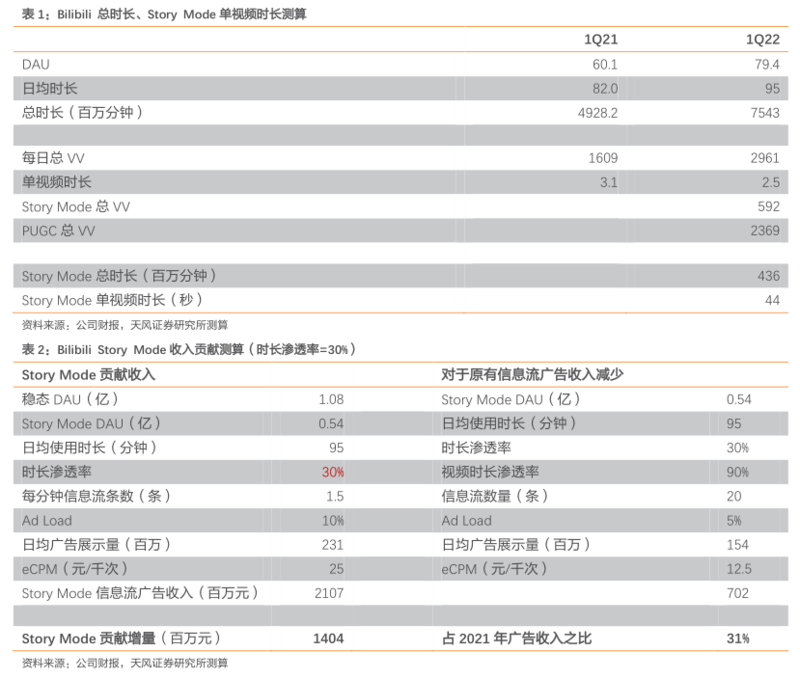 1.根据公司1Q22业绩会,Story Mode对B站为纯增量贡献。根据公司业绩会,一季度,B站VV数同比增长84%,其中Story-Mode占比超20%,除Story-Mode外,B站的PUGV增长也保持50%以上的增长,与过去增长速度持平; 2. Story Mode为B站带来运营数据边际上持续改善。1Q22,B站时长达95分钟,较去年同期净增加13分钟,超过前期疫情高点(1Q20为87分钟); 3.我们测算Story Mode贡献收入在数十亿量级。考虑到Story Mode上线前Bilibili平均每用户观看时长稳定在3分钟左右,我们按照3分钟时长为除Story Mode以外视频的平均时长,按照20%的渗透率测算Story Mode视频时长,测算得Story Mode单视频时长在45秒左右。依据此测算Story Mode对广告业务的贡献,在4亿MAU的假设下,假设Bilibili DAU/MAU为27%(1Q22数据)、时长为95分钟,假设Story Mode用户在用户B站总时长渗透率分别为30%/50%/70%,测算得Story Mode对B站广告业务收入增量贡献在14亿~33亿之间,占21年B站广告业务收入在31%~72%之间。